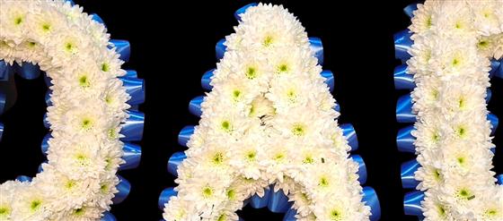 Floral Dad tribute based with white chrysanthemums, ribbon colour of your choice and top sprays to match.