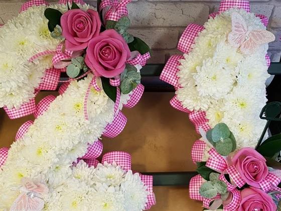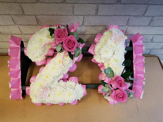 Numbers to commemorate a special graveside birthday these are made on a bar, with white chrysanthemums, ribbon of your choice and stunning top spray to match.