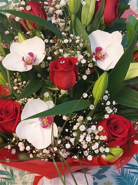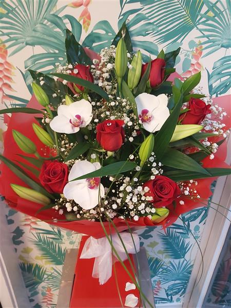 Beautiful hand tie of 6 long stemmed red roses with lilies and orchids with seasonal foliages.