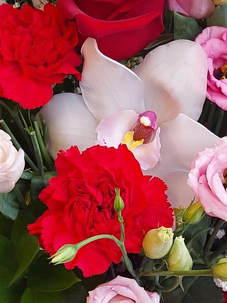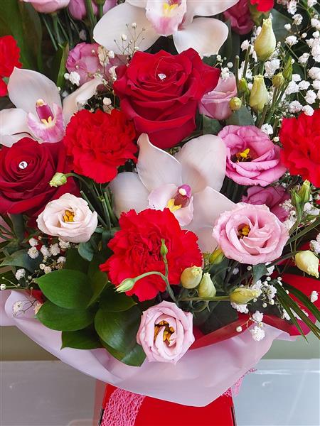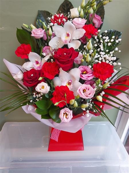 Beautiful red and pinks floral arrangemen includes red roses orchids and carnations.