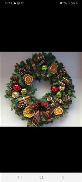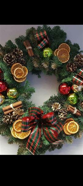 Traditional fresh Christmas wreath with all the festive accessories with Tartan bows. This product is suitable for displaying on your front door or to be placed at a loved ones grave.